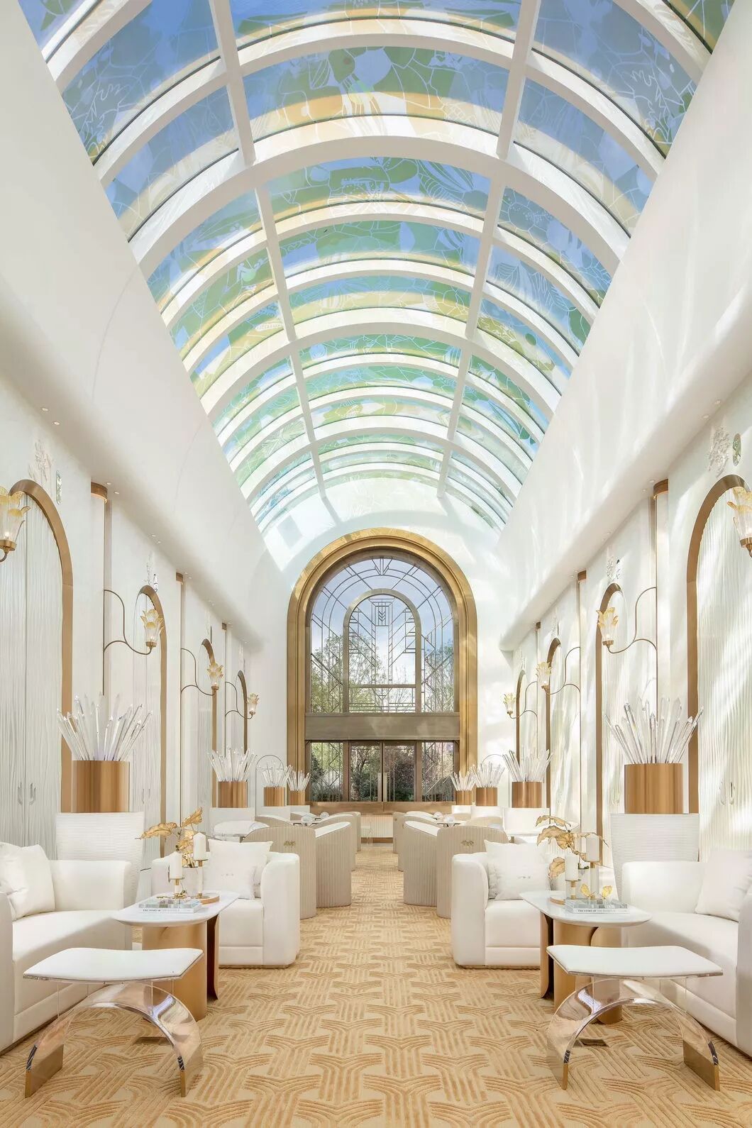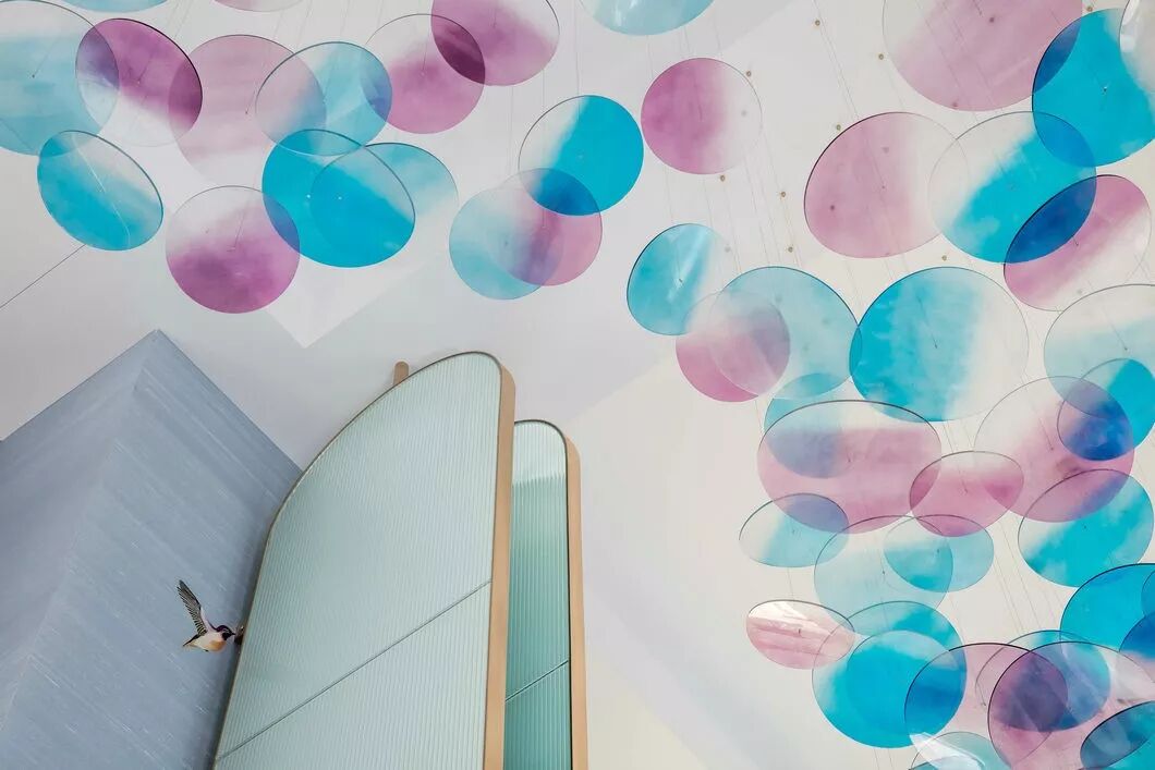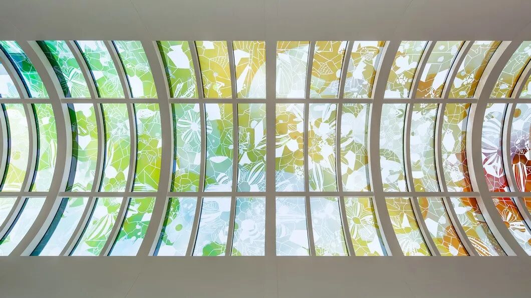 多彩的花瓣布满整个中庭天花,阳光洒下穹顶,透过五彩的花瓣折射出的光线让整个洽谈区形成一个春意盎然的繁华长廊