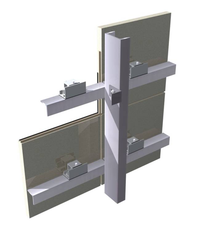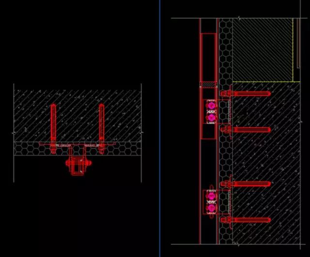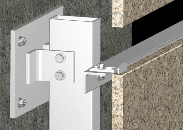 此结构属石材干挂技术第三代产品,是目前世界上较先进技术,是国内石材幕墙技术发展的方向,其特点是实现石材的无应力加工,石材背面采用不锈钢背栓连接,连接强度高,板块抗变形能力强,且板块破损后可实现更换要求,适用于高层建筑。