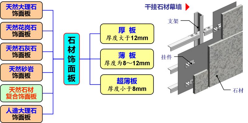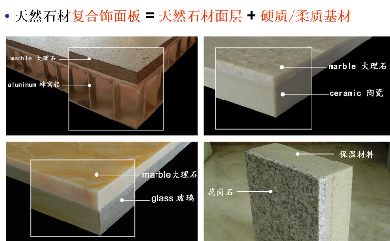 其中,(超薄)天然石材复合饰面板通常由天然石材面层与蜂窝铝、陶瓷、玻璃或轻质保温材料基层复合而成。