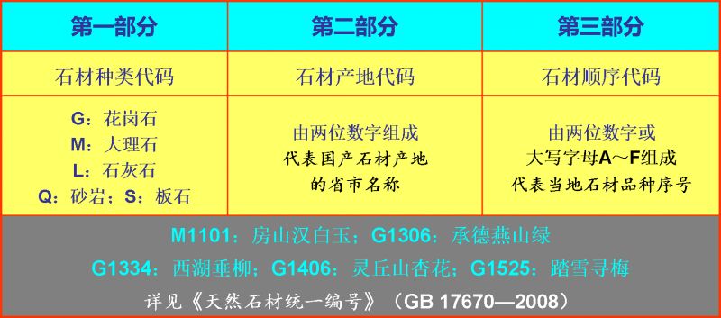 为了使石材的使用和市场交易规范统一,国家对包括花岗石、大理石、石灰石、砂岩等在内的天然石材进行了统一编号。该编号由石材种类代码(大写字母)、产地代码(两位阿拉伯数字)和顺序代码(通常也是两位阿拉伯数字)三个部分组成。