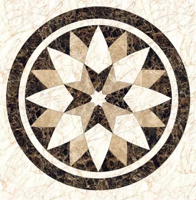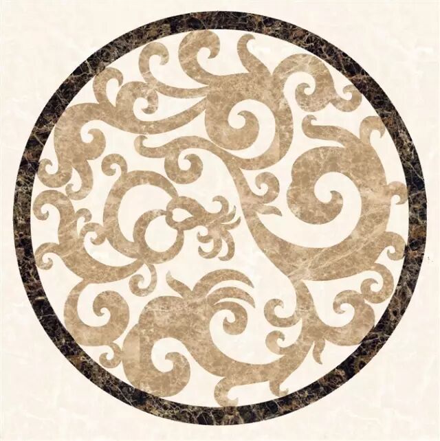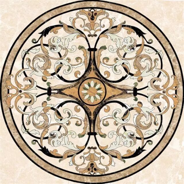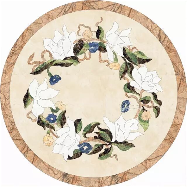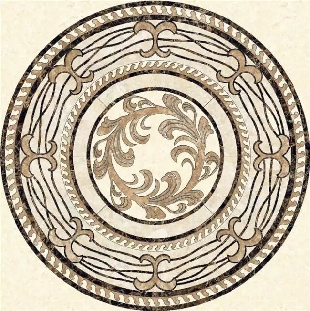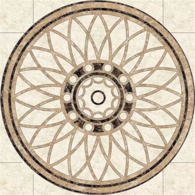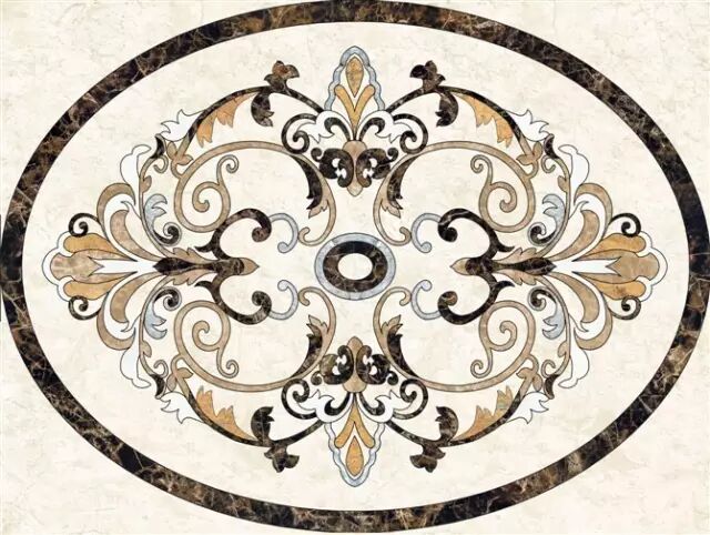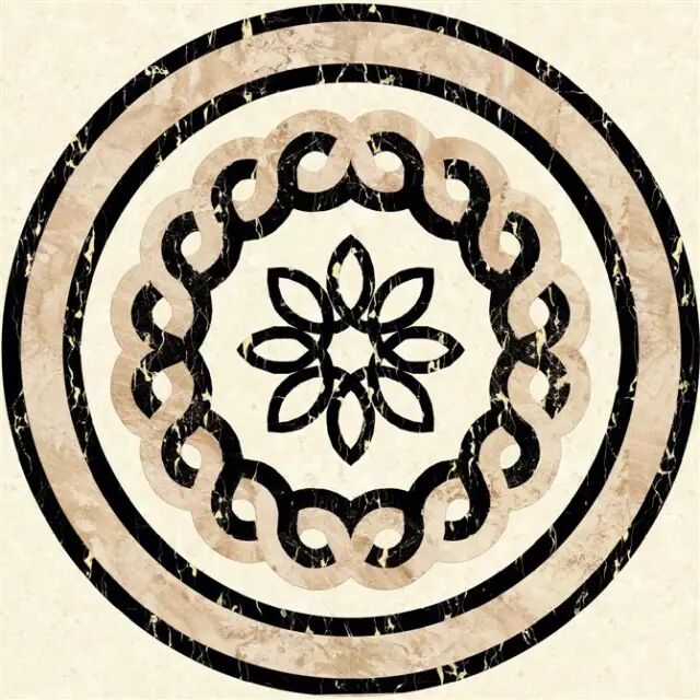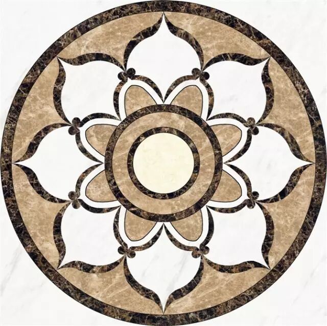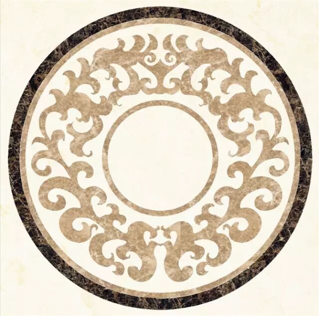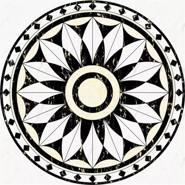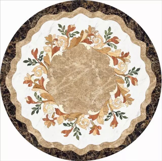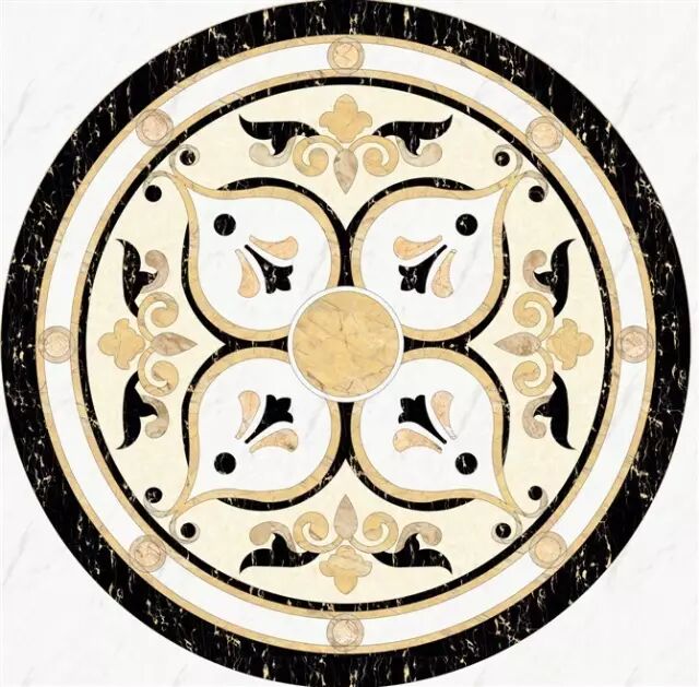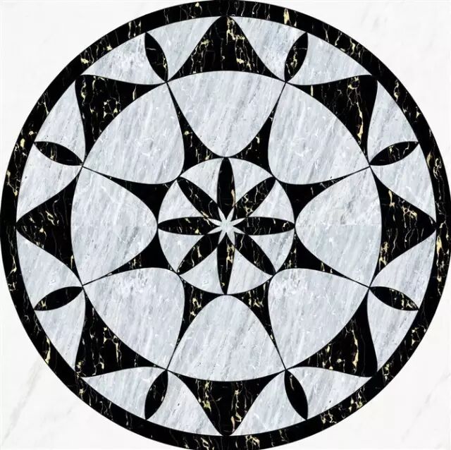 石材拼花在现代建筑中被广泛应用于地面、墙面、台面等装饰,以其石材的天然美(颜色、纹理,材质)加上人们的艺术构想“拼”出一幅幅精美的图案。水刀拼花工艺虽然是简单的圈层波纹,但是却是十几种石材的拼接而成。
