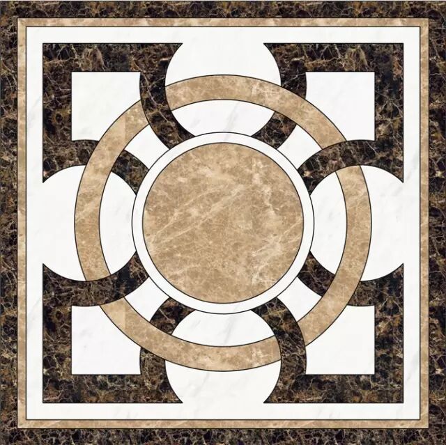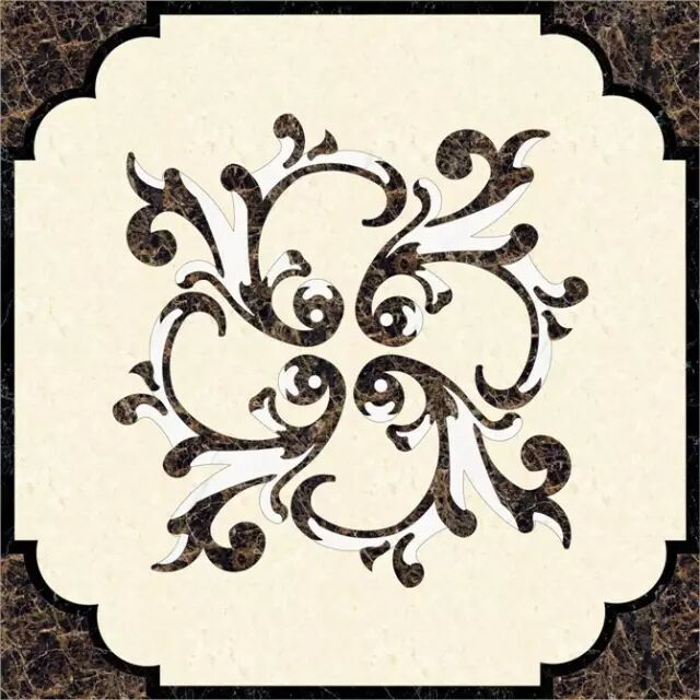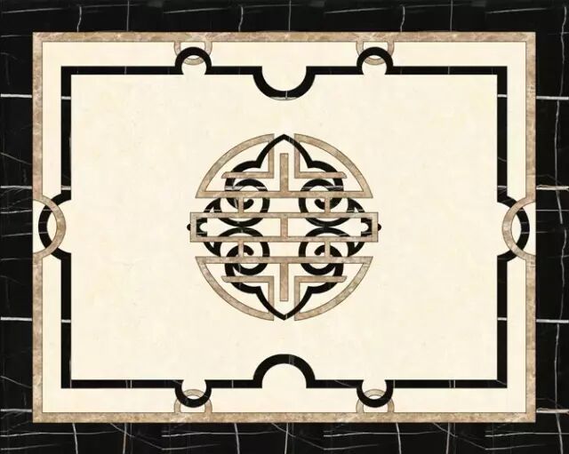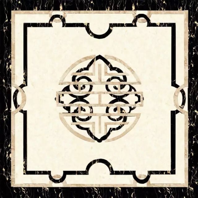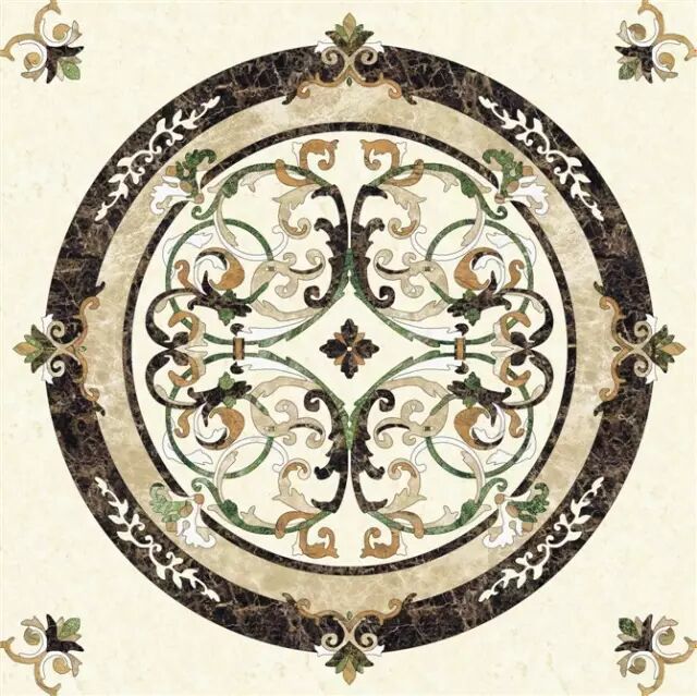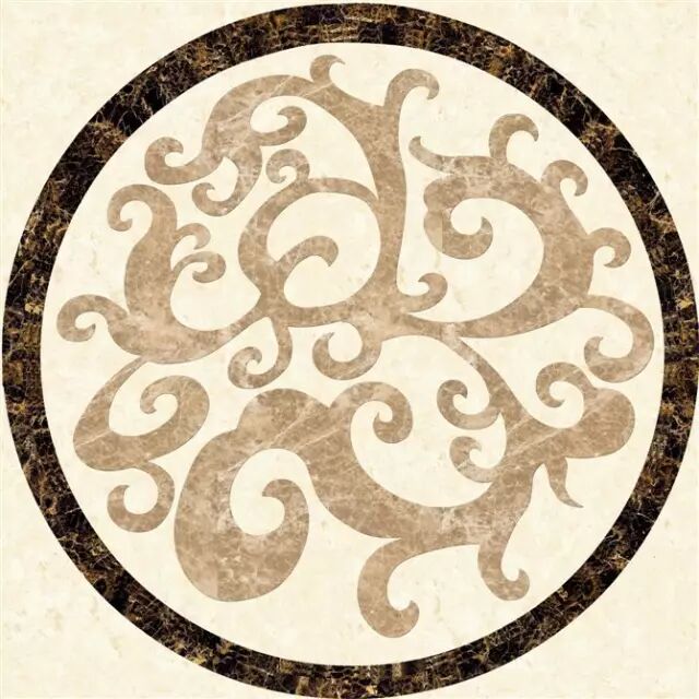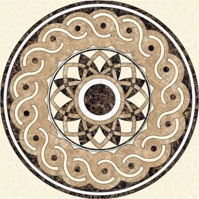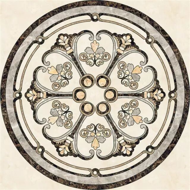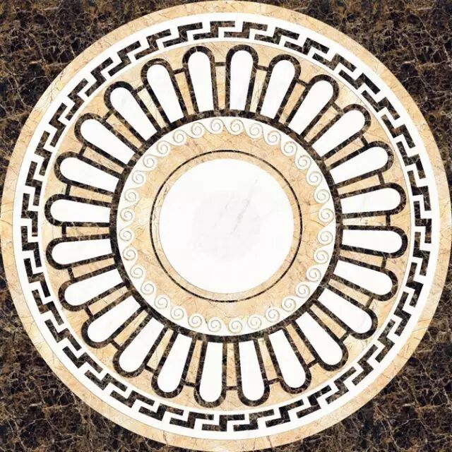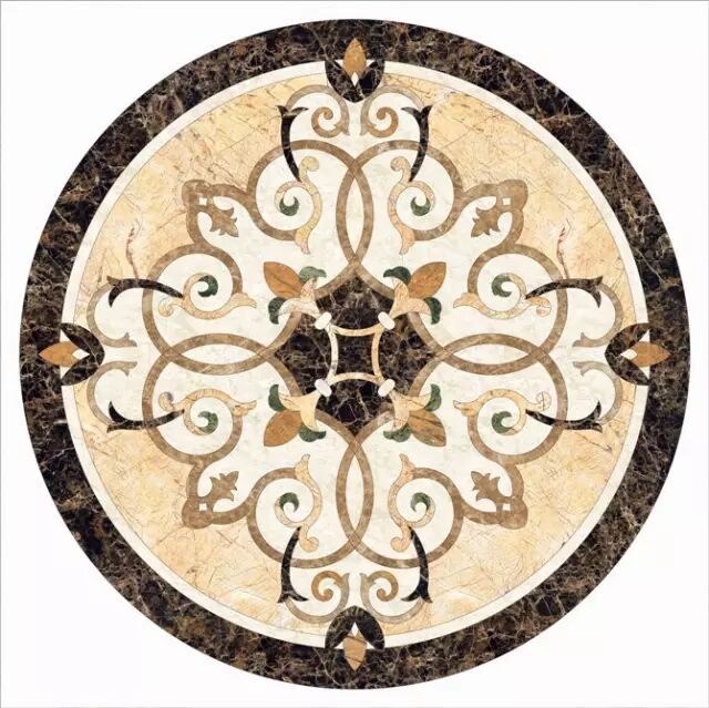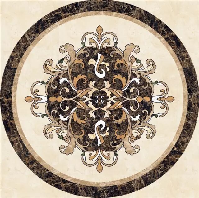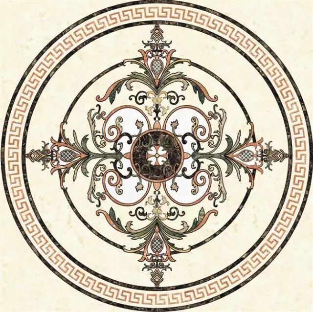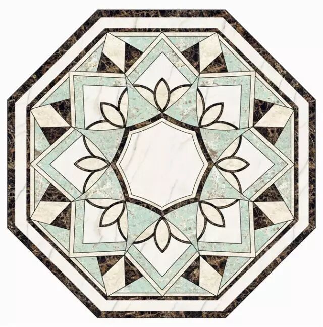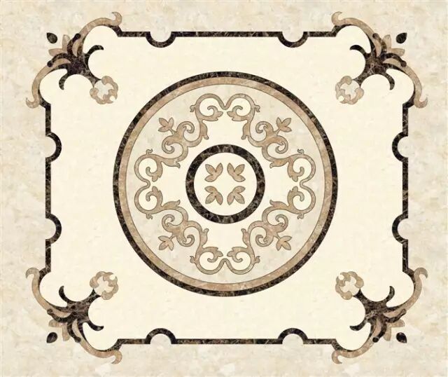 石材拼花在现代建筑中被广泛应用于地面、墙面、台面等装饰,以其石材的天然美(颜色、纹理,材质)加上人们的艺术构想“拼”出一幅幅精美的图案。水刀拼花工艺虽然是简单的圈层波纹,但是却是十几种石材的拼接而成。
