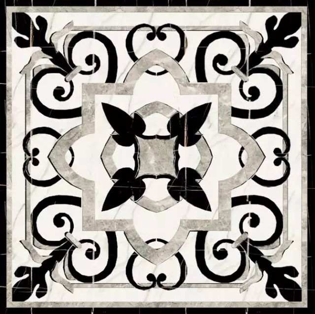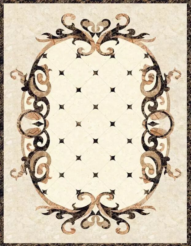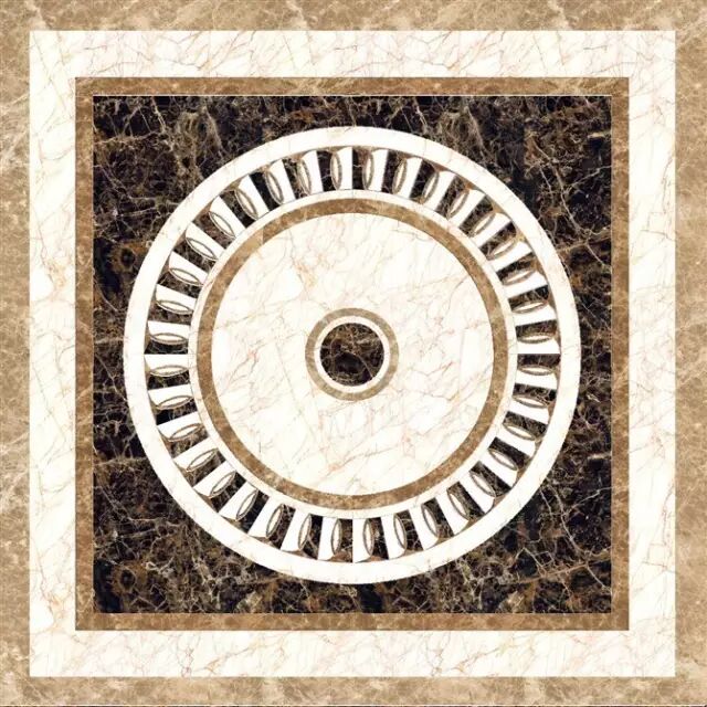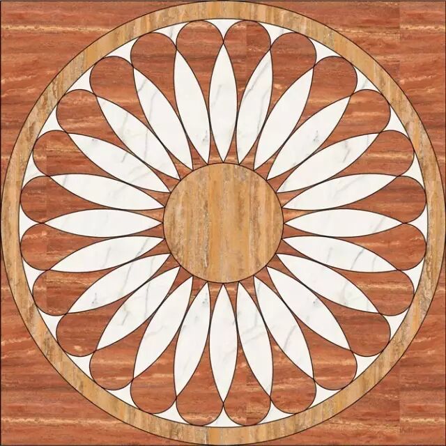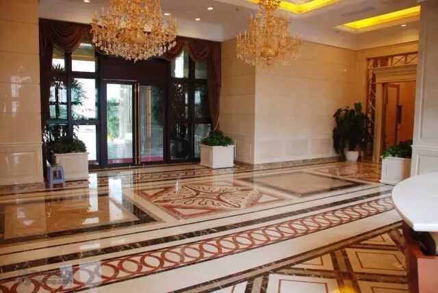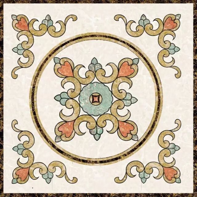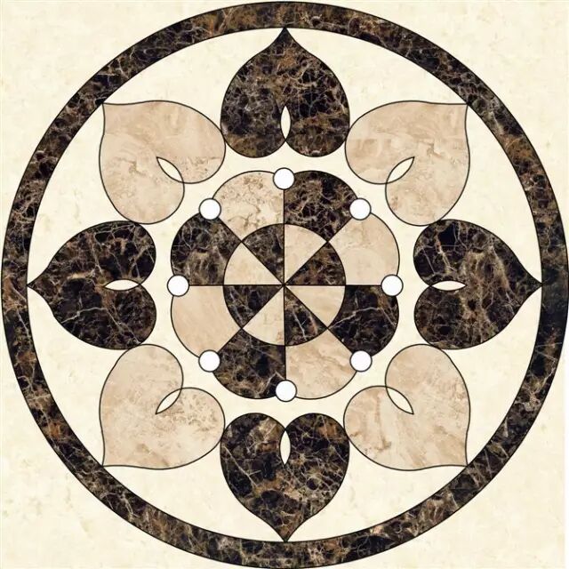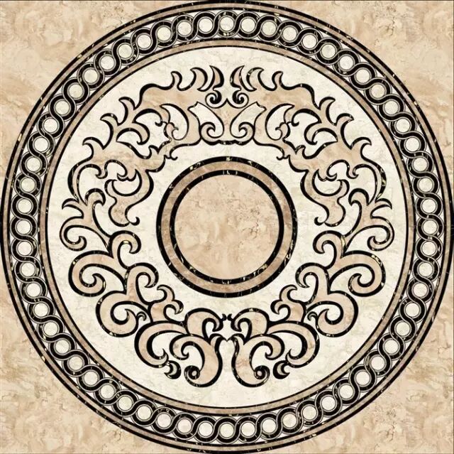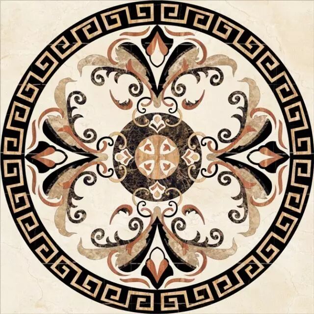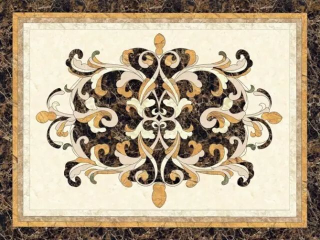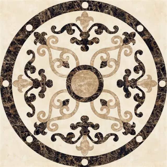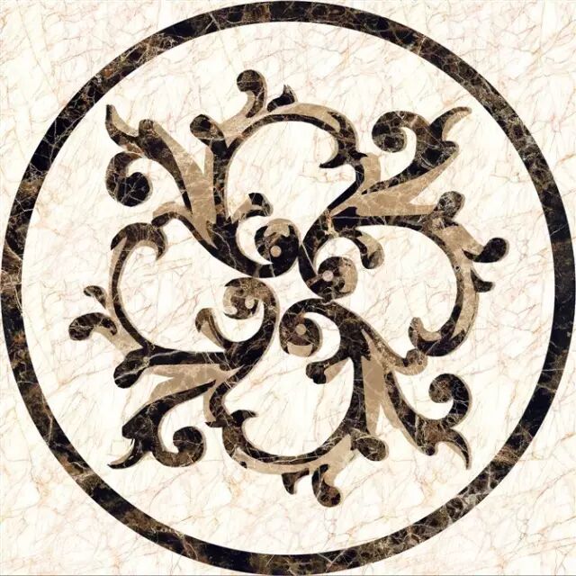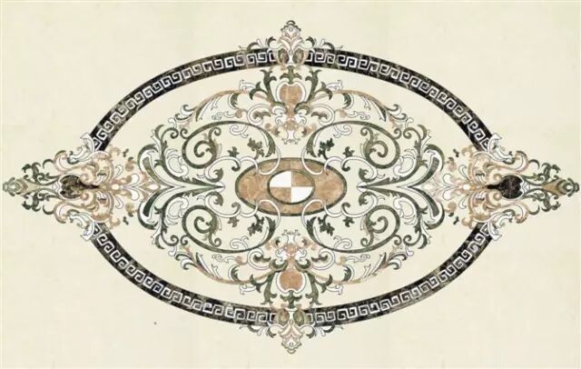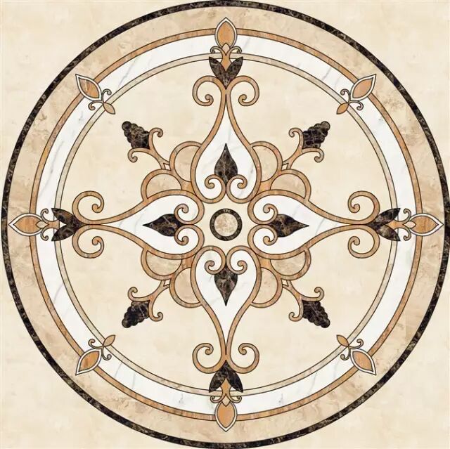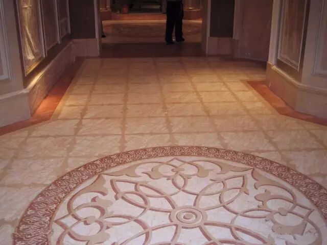 石材拼花在现代建筑中被广泛应用于地面、墙面、台面等装饰,以其石材的天然美(颜色、纹理,材质)加上人们的艺术构想“拼”出一幅幅精美的图案。水刀拼花工艺虽然是简单的圈层波纹,但是却是十几种石材的拼接而成。