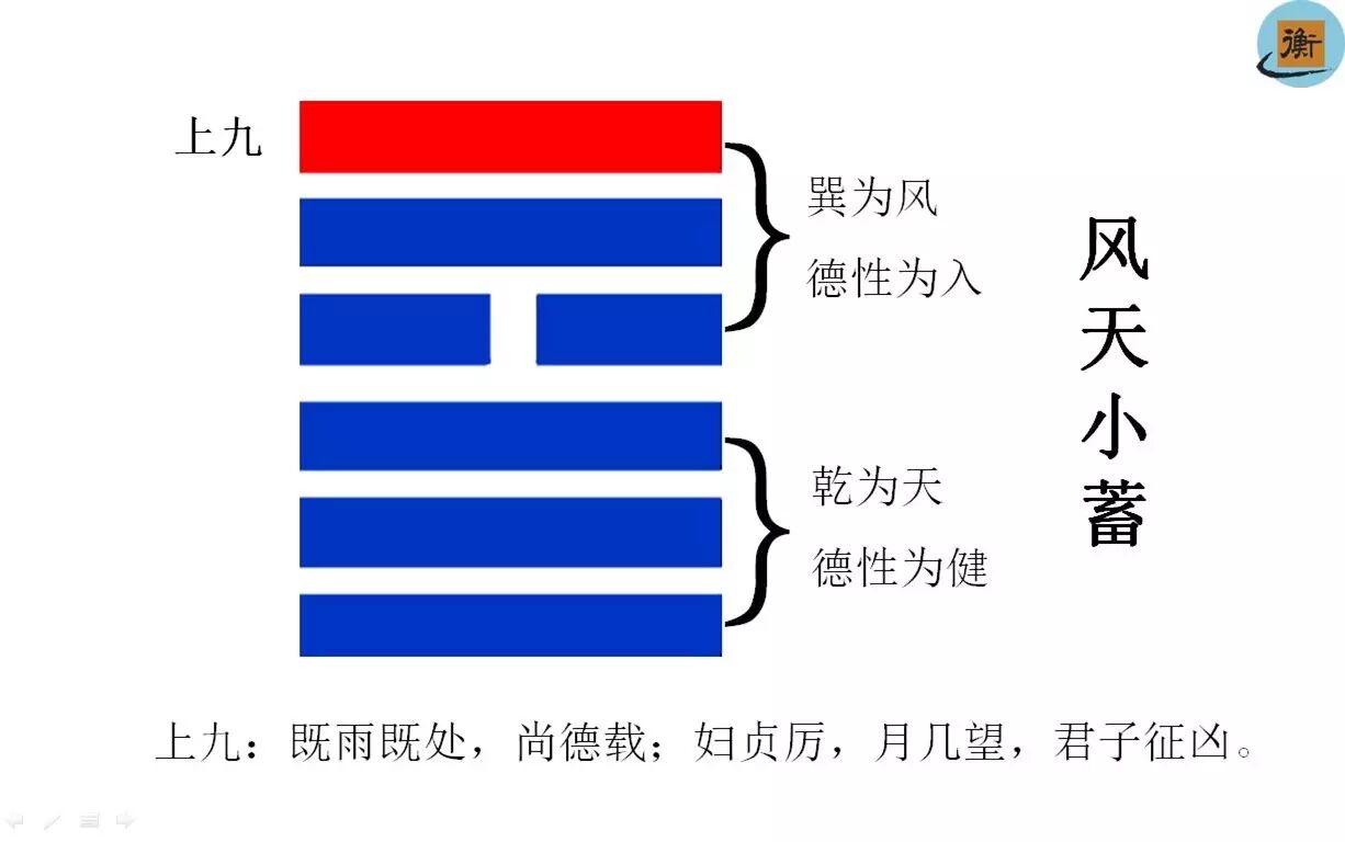 一、《小畜》卦之上九爻辞:“既雨既处,尚载德;妇贞历,月几望,君子征凶。”(密云已降成雨,上位的阳德已被畜止;妇人守持正固以防凶险,月亮就要圆满,君子前往必有凶险。)
