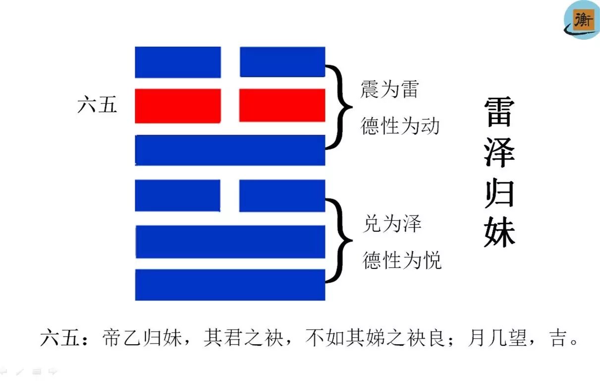 二、《归妹》卦之六五爻辞:“帝乙归妹,其君之袂,不如其娣之袂良;月几望,吉”。(帝乙下嫁其妹,作为正室的衣饰,却不如侧室的衣饰那么美好;月亮就要圆满,吉祥)