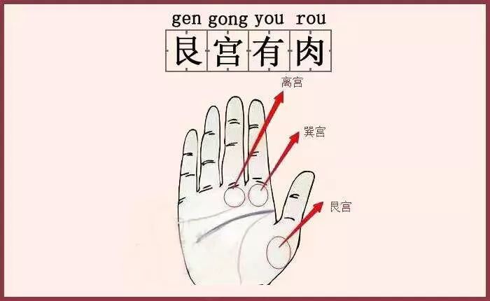 艮宫指的是一个人的大拇指下面肌肉的位置,属于一个人的艮宫,主贵人运势,横财运势,如果一个人的艮宫有肉,说明此人天生就能旺财,能聚财,属于生财有道之人。