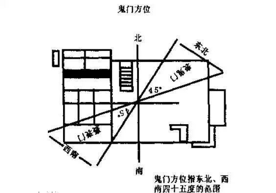 只要看图即可明白,从房子或宅地的中心来看,东北四十五度之范围叫“表鬼门”或“男鬼门”,正相反的西南四十五度范围叫“裹鬼门”或“女鬼门”。而通过表鬼门、裹鬼门中心的线叫“鬼门线”。家居风水上,鬼门线尤其具有重要的意味,这一点是首先要记住的。