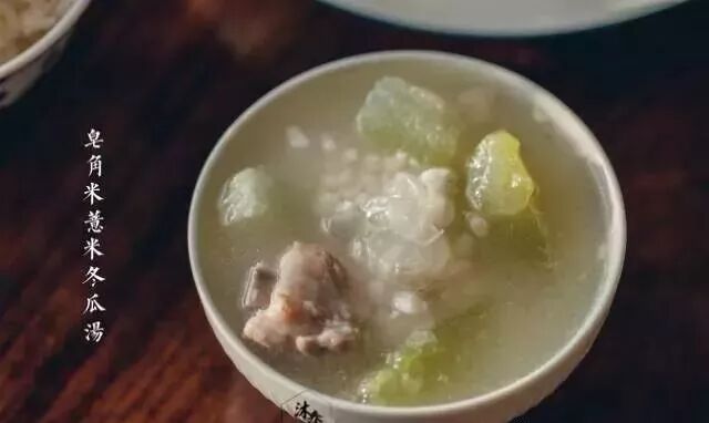 2、将排骨、薏米和姜片下锅。先用大火把汤煮开,然后调成小火煲1个小时,然后加入皂角米和冬瓜继续煲大约30分钟