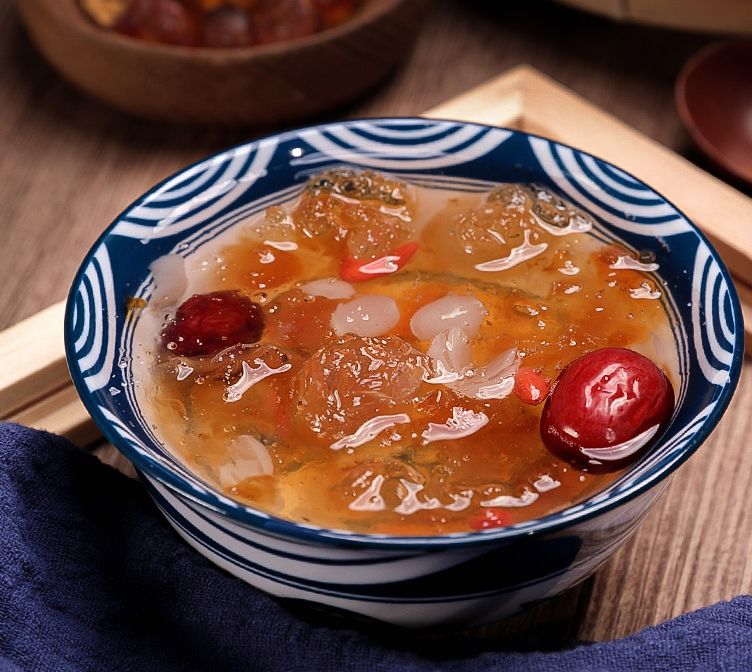 7.待桃胶银耳煮至软糯粘稠时加入适量黄片糖,糖融化后即可食用了。