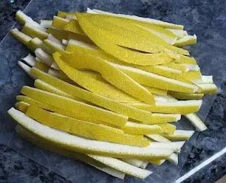 再把柚子皮切成细条,放入热水中,加上两勺盐,搅拌。然后换一次热水,浸泡2个小时左右。