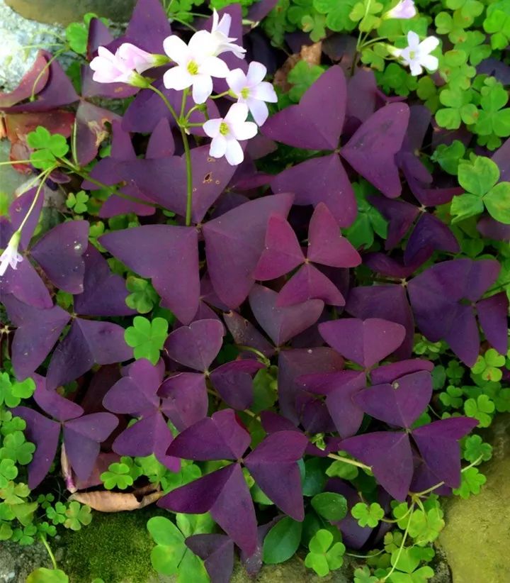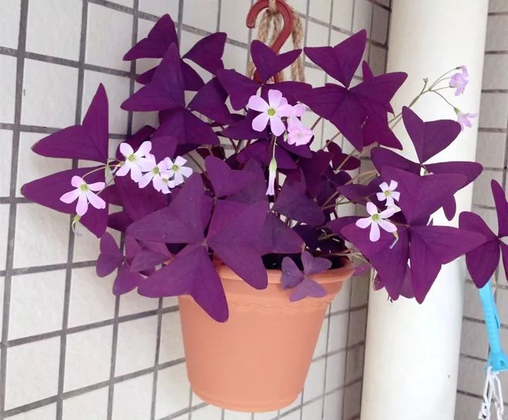 紫叶酢浆草是多年生的球根(鳞茎)植物,比一般的酢浆草更高大一些,最高有30厘米。它的叶子好像一只只紫色的蝴蝶,养在家里观叶也很不错。
