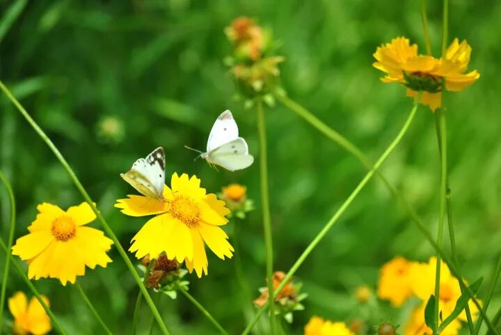 金鸡菊(拉丁学名Coreopsis drummondii Torr. et Gray):菊科,金鸡菊属多年生宿根草本植物,叶片多对生稀互生、全缘、浅裂或切裂。金鸡菊的花单生或疏圆锥花序,舌状花,黄、棕或粉色。管状花黄色至褐色。春季4月底露地直播,7-8月开花,花陆续开到10月中旬。二年生的金鸡菊,早春5月底6月初就开花,一直开到10月中旬。