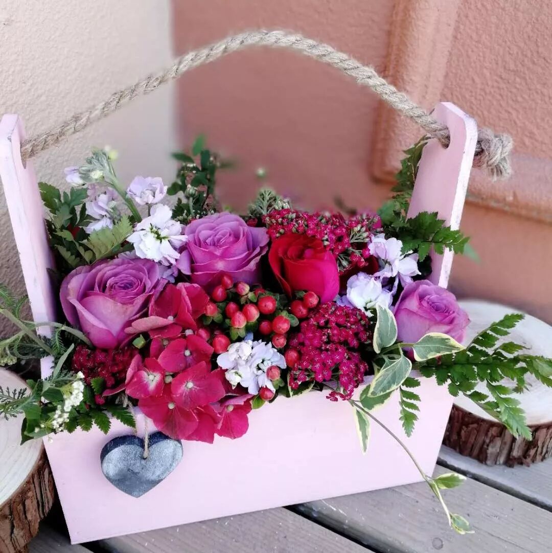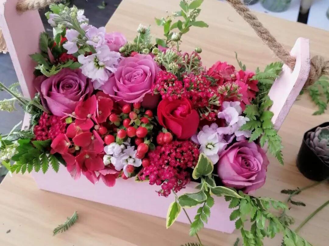 ▼5.最后将装饰品放上,贴上你的花店的logo,我们的小花篮便做完啦