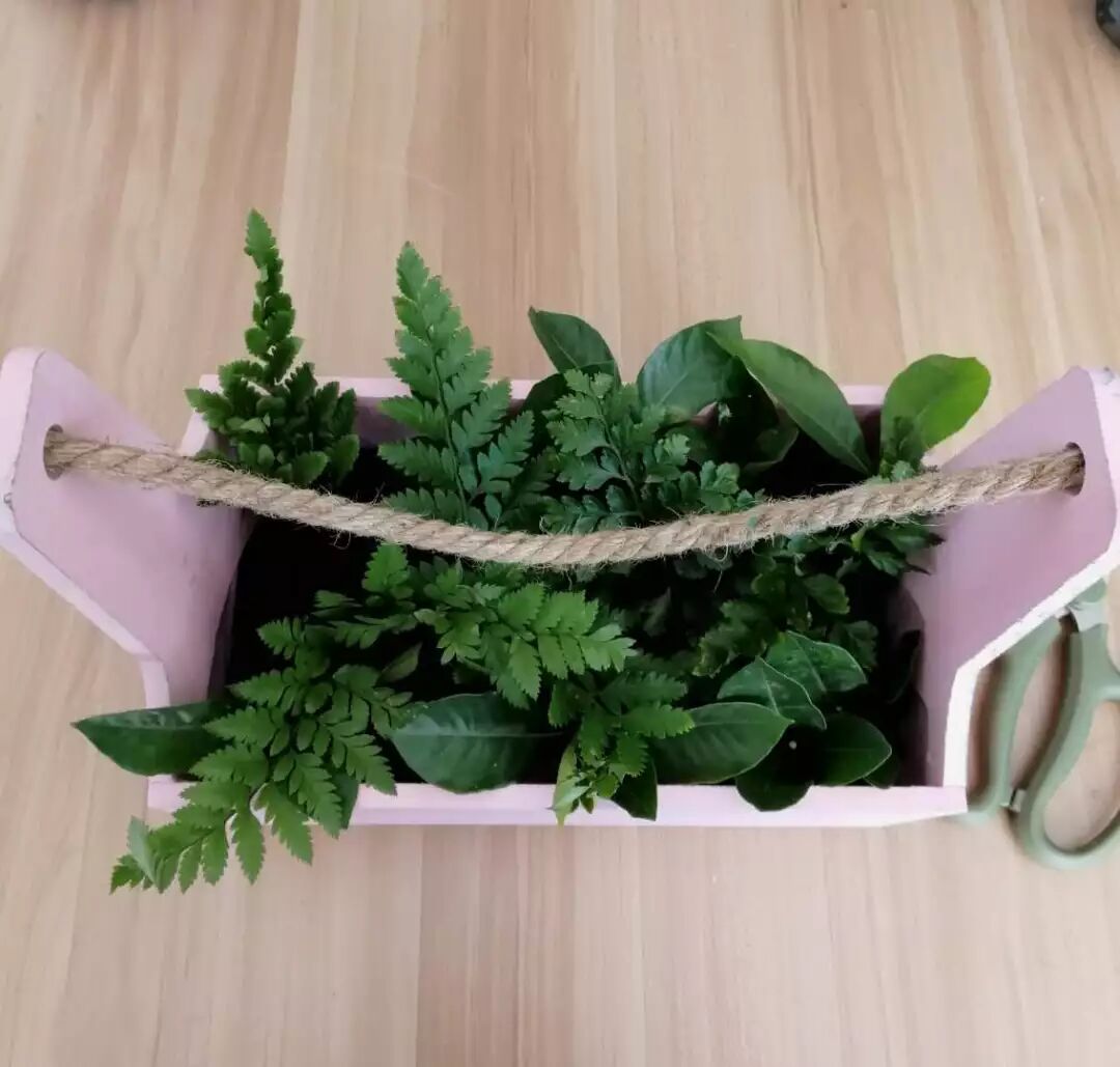▼2.用叶材将花泥进行遮盖,可以用栀子叶、高山羊齿、尤加利都可以。