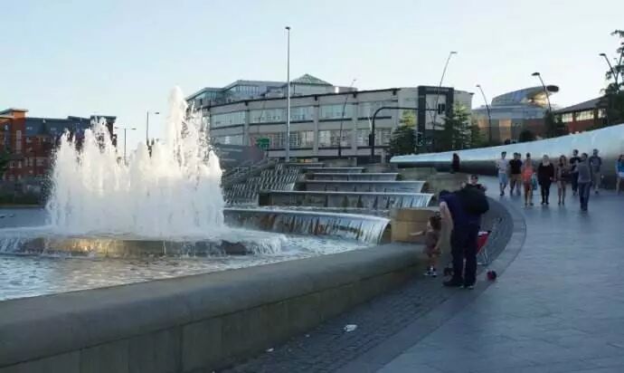 谢菲尔德火车站的站前广场是一个坐落于英国的现代景观中声景营造案例。广场的各种水景在频谱和声级动态范围方面都很丰富,各种心理声学指标如响度、粗糙度、尖锐度和波动强度等都被运用其中并为使用者提供了一场“音乐会”。
