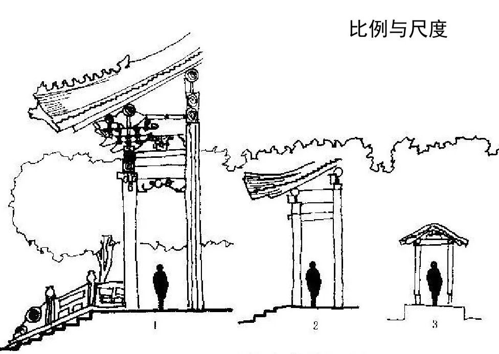 比例只能表明各种要素间的相对数比关系,不涉及对比要素真实尺寸。比例寄于良好尺度中,景物恰当的尺度要有良好比例体现。美应当要“恰到好处”。正确的比例尺度应和功能审美要求相一致并和环境协调。