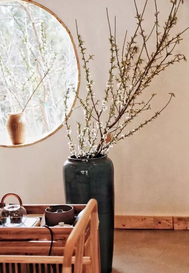 中式茶室有一面靠湖的圆窗,窗外种着一棵腊梅。透过窗户望出去,外面的景致就像一幅流动的画一样,常常美得让人移不开眼。