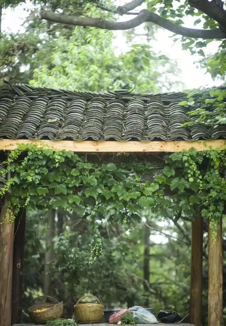 院子里搭了一处凉亭,空闲的时候可以坐在那里纳凉、休憩,或者在绿荫下择菜、聊天,小时候的场景依稀回在眼前。