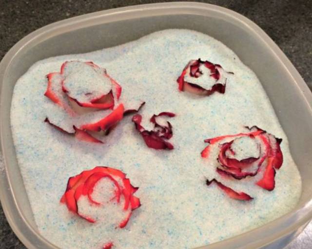 1.首先在微波炉专用盒子中加入一层两厘米左右的二氧化硅(也就是干燥剂),然后将玫瑰花头剪下来,放在盒子中,慢慢添加干燥剂,直到将玫瑰花全部盖住。