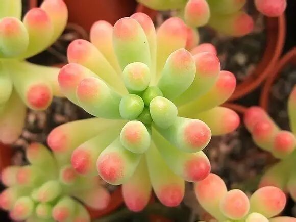 千佛手的叶型也是非常美腻的,叶片上有一层薄薄的细粉,叶插长出的黄绿色的叶片和成株后蓝绿色的叶片都非常的可人,叶插时的出芽速度不快,但是出芽率还是可观的。当千佛手有充足的阳光时,透明的果冻质感绝对够惊艳!
