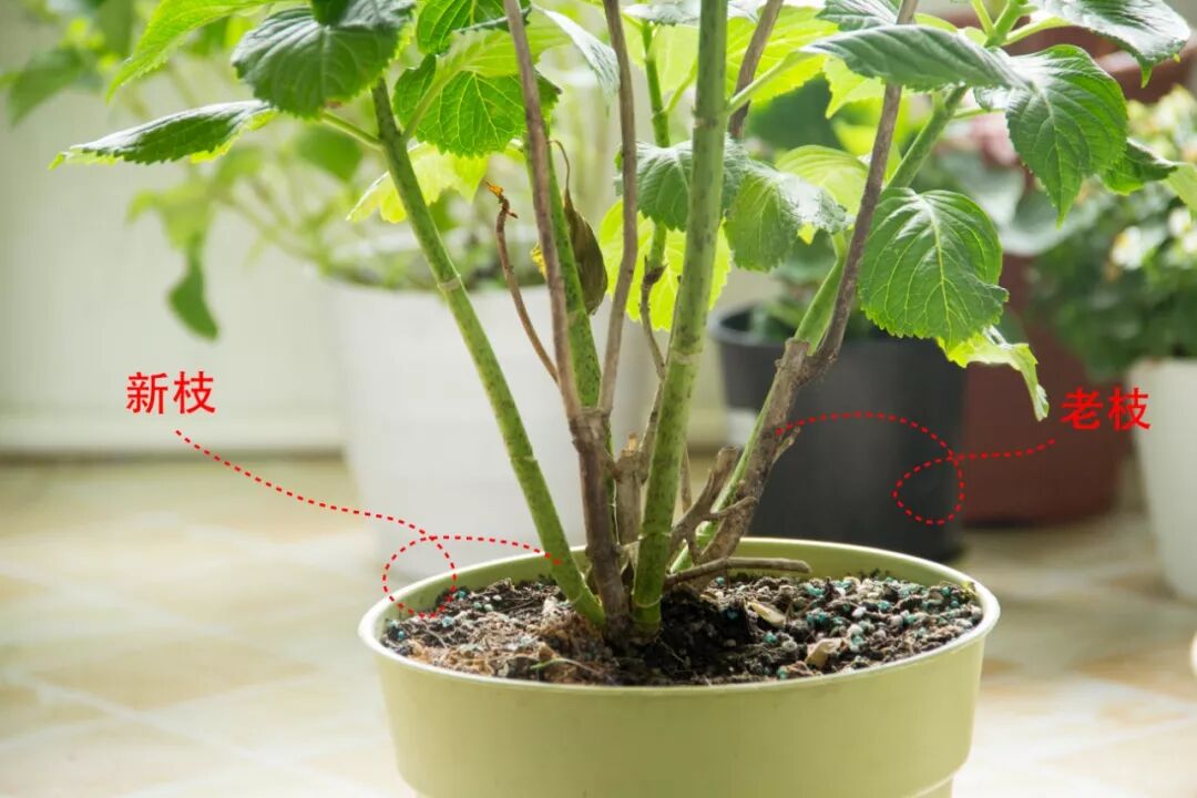 绣球生长迅速,长势强健,对养分、水分需求很多,秋末春初绣球休眠时,给绣球换盆,更换一部分老土,添加新土和缓释肥,扩展生长空间,可以促进绣球春季萌发更多的新枝,更多的新枝也意味着能开出更多的夏花。