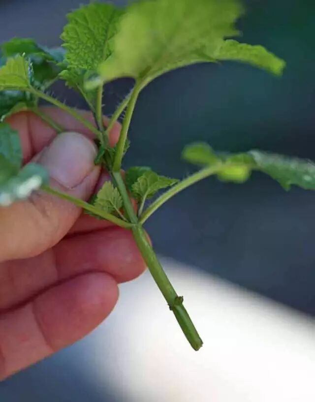 去掉薄荷插穗底部的叶片。如果将插穗的叶片插到水里,由于水影响了叶片的呼吸作用,很容易导致叶片腐烂,所以干净利索的把插穗底部的叶片都处理干净吧。