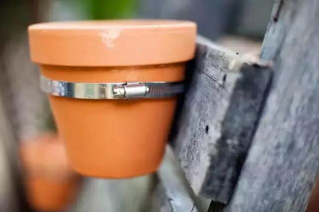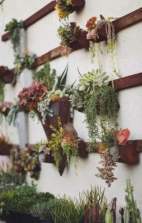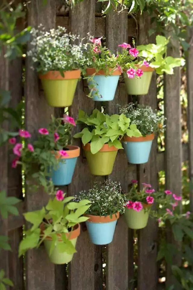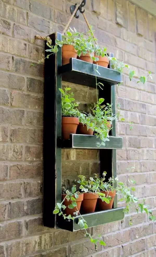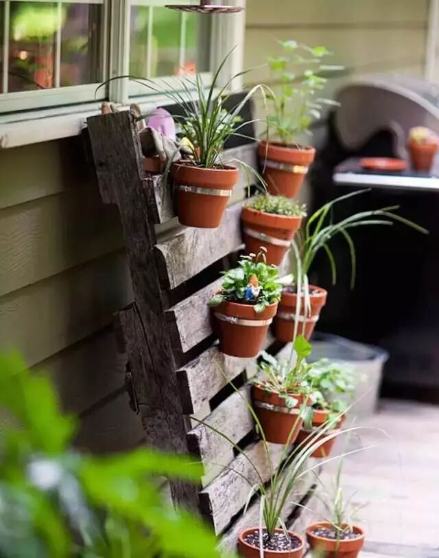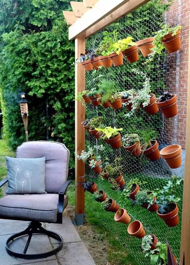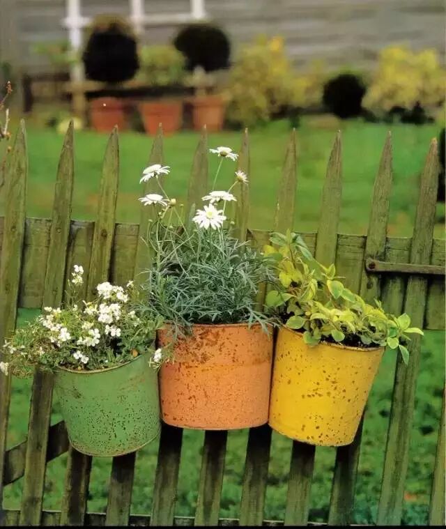 谁说盆栽只能放在桌子或者地面上的?除了这两个地方,你还可以把它们挂在任何一面你能看见的墙上。比如你可以模仿绿篱上的藤蔓植物,把它们挂在栅栏上,同时挂花盆比种植绿篱更加方便和快捷。