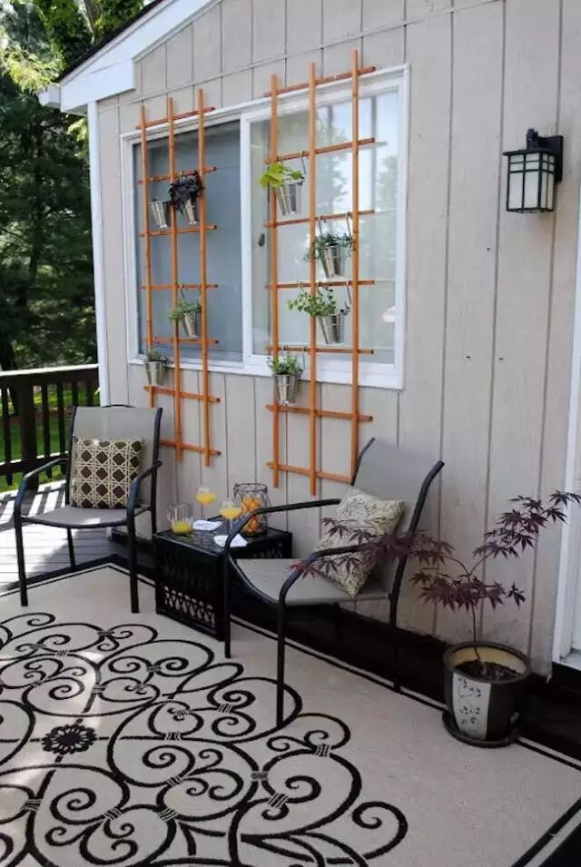 这个方法就是在窗前搭个网格型的架子摆放植物,丰富窗台前的单调。用锡槽承载着草本植物,逐个逐个地挂在格子上,是一个效果不错的装饰手法,同时也很节省空间和材料。除了植物,你还可以放灯笼、蜡烛、雕塑等等一些装饰品在上面。