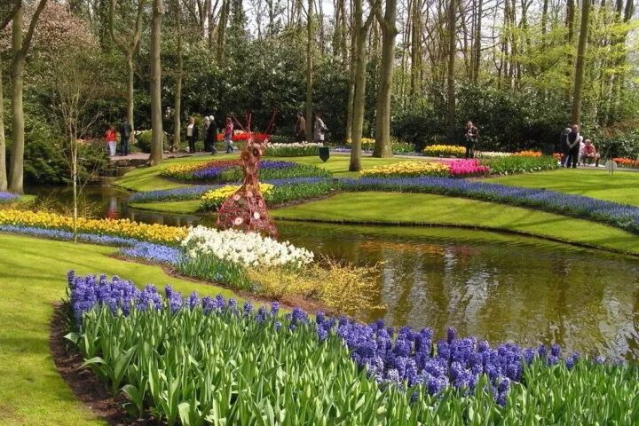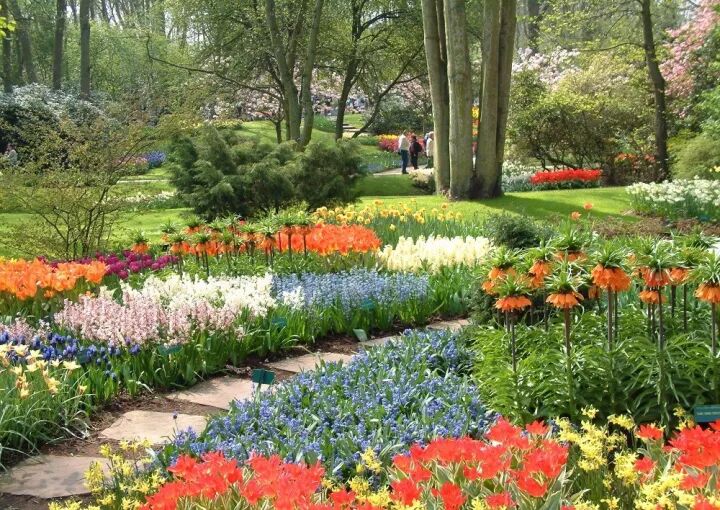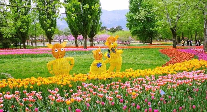 球根植物突出的是色彩,但它们毕竟高度较为低矮且非常一致。如果仅仅大片单一种植,多少有些单调。因此结合大树和一些灌木种植,会让整个空间的层次变得更为立体。在画面的视觉焦点处点缀恰当的景观小品,会增加风情和趣味。
