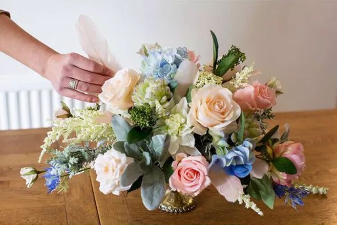 因整个作品是马卡龙色系,最后可插入几片粉色羽毛,增添梦幻的感觉。