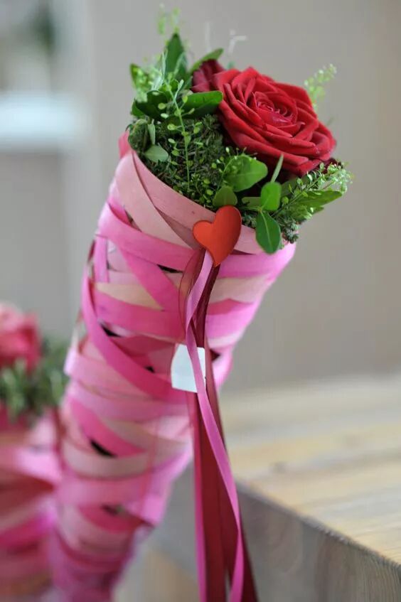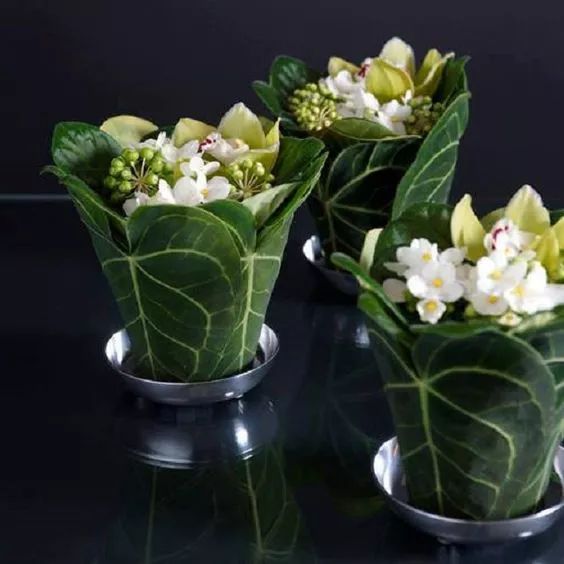 用叶卷成锥杯造型。一般起遮盖花泥的作用。
