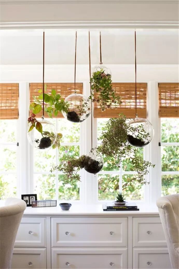 将植物用绳子挂起来,可以更少的占用空间,在视觉上更有冲击力。缺点是养护起来比较麻烦,浇水时需要大家将花盆取下再养护。