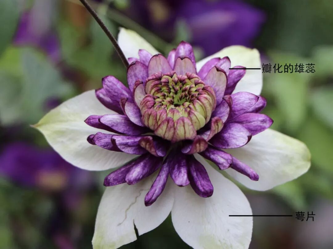 不过有时候,植物的花并不是完整的,可能会缺少一个或几个部分,有时候花萼、雄蕊、雌蕊还会改变形态变成花瓣的形状,比如我们常见的单瓣铁线莲的花就是它的花萼,重瓣的铁线莲的花除了花萼还有瓣化的雄蕊和雌蕊。