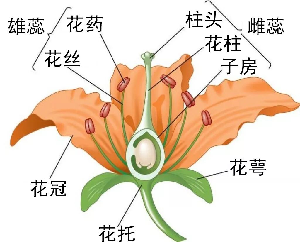 一朵完全的花在结构上分为花萼、花瓣(所有的花瓣合起来称为花冠)、雄蕊、雌蕊等部分。
