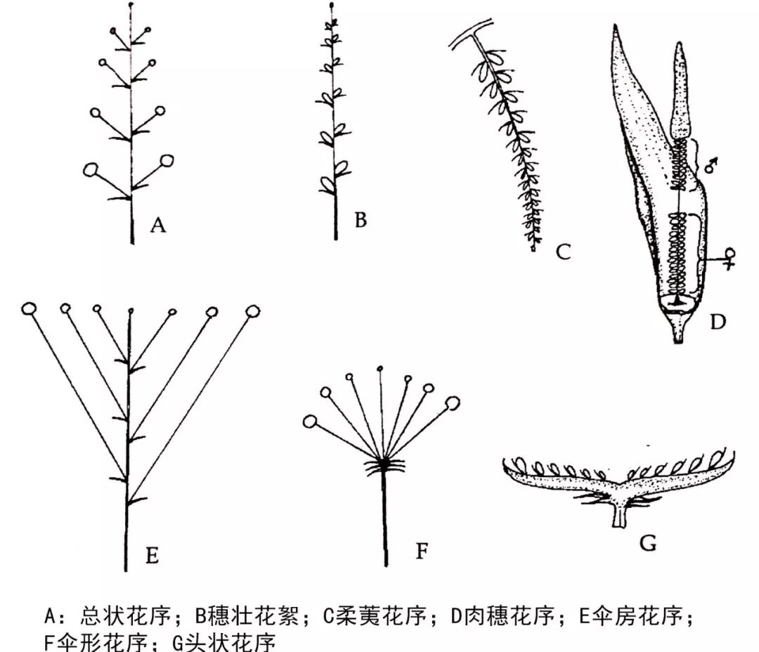 在专业上,各种花序被归纳成了几大类型,因为这部分和植物养护关系不大,所以小编就放个花型简笔图,不再展开了。