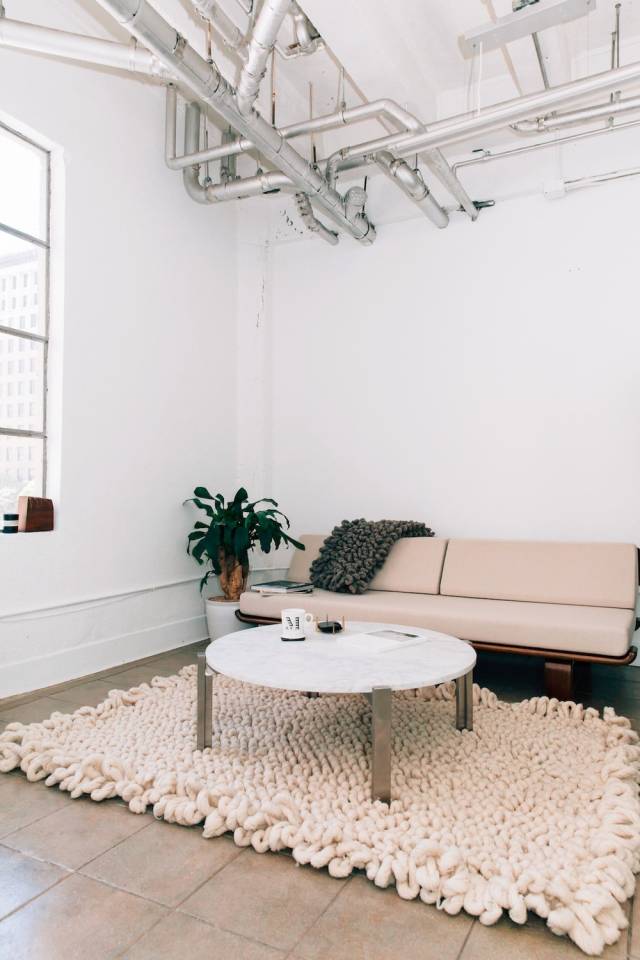 简单大气的水泥地面配上麻绳编制的圆形地毯很有质感,充满田园风。