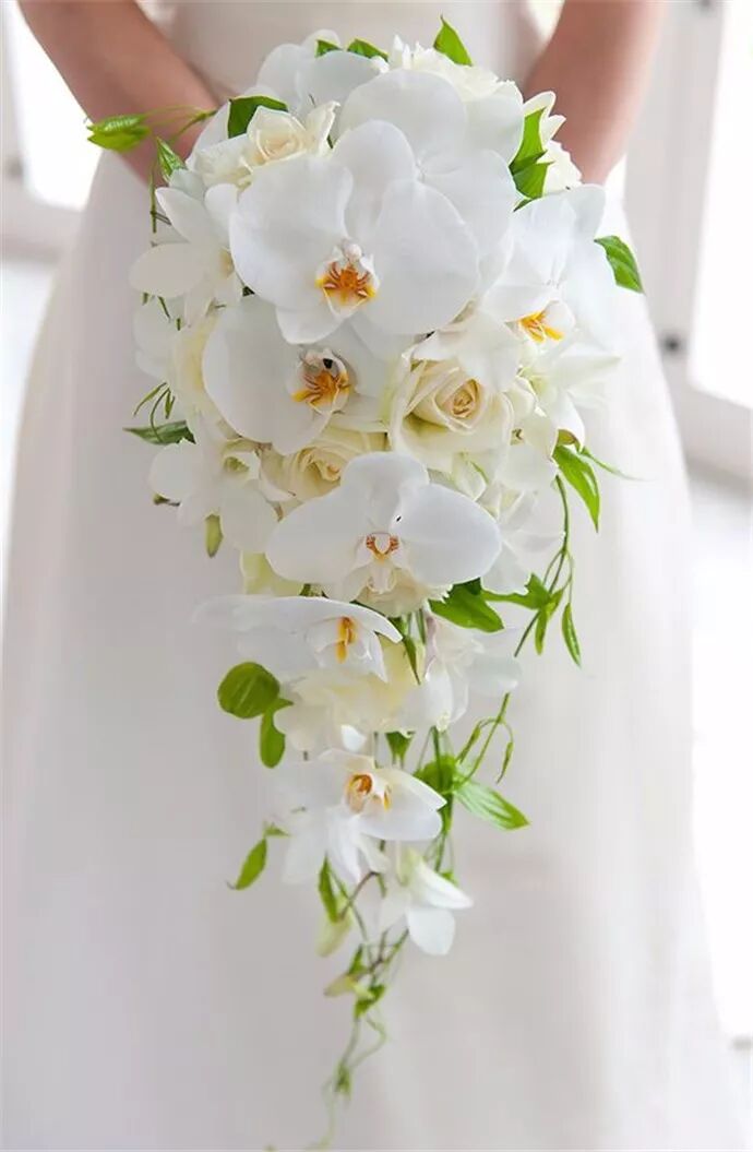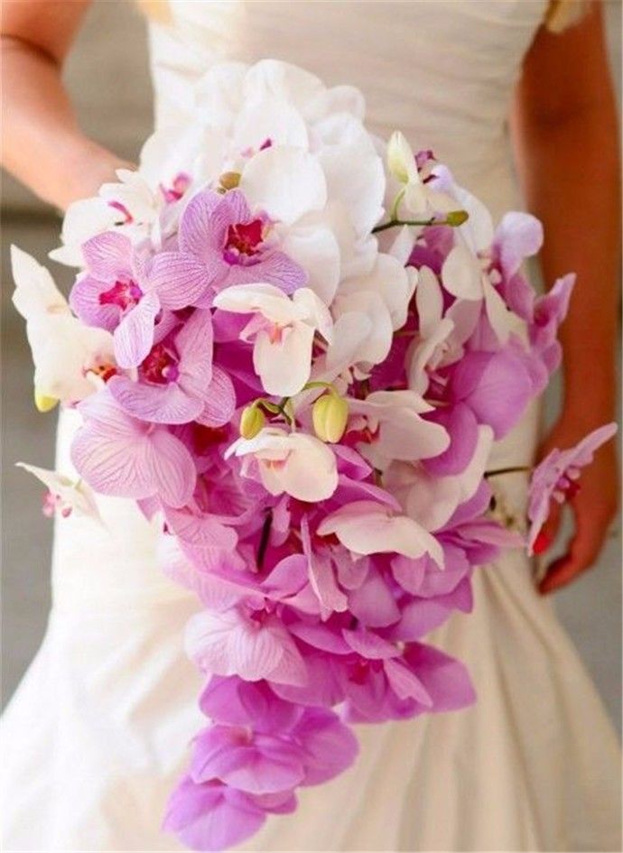 蝴蝶兰的花梗特别长,一个花枝上能开八九朵,状如翩飞的蝴蝶,非常适合制作瀑布型手捧花,高贵典雅又大气,身材修长的女生不妨尝试一下。