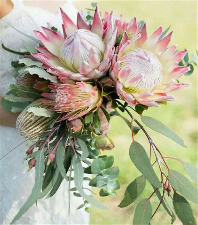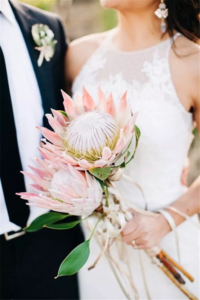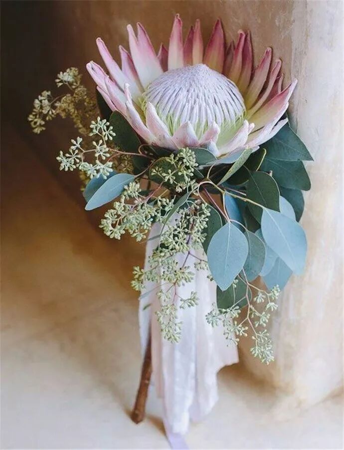帝王花自带高贵气质,长得富贵华丽,气派十足,被称为“花中之王”,价格也不便宜。当然我们不需要买太多,两三只帝王花就能做成一束非常漂亮的手捧花,特别适合那些气场强大的姑娘。