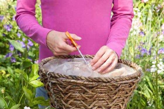 1、找一个吊篮,里面用塑料纸围起来,在吊篮里放一些泥土。