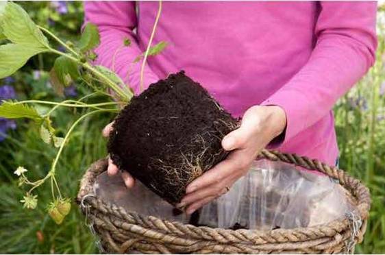 2、将买回来的草莓秧苗,带着底部的泥土一起放进吊篮里。