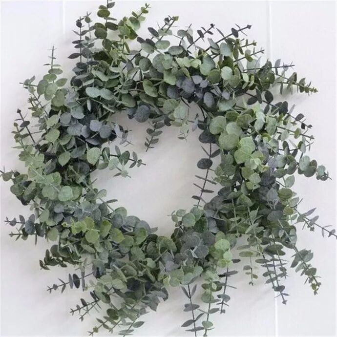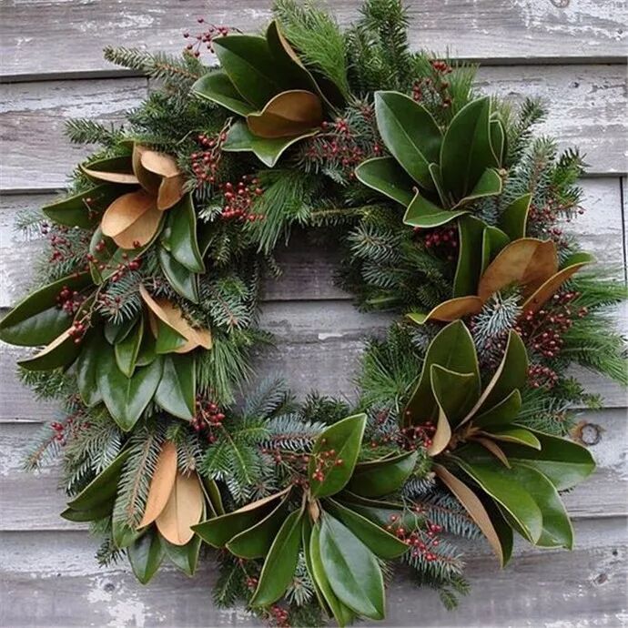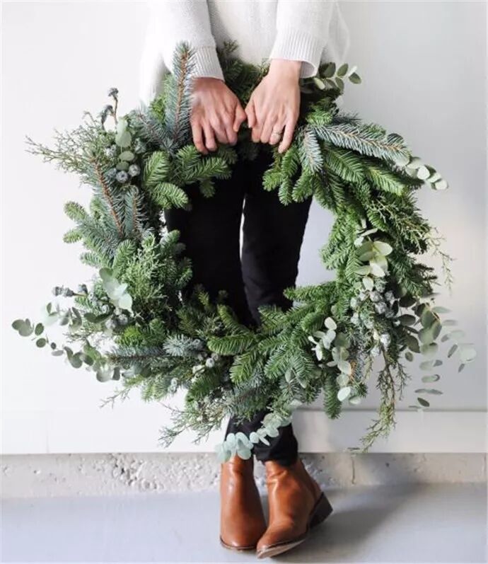 如果你身边没有足够的材料制作花环,这是最简单的一种方法了。只需要去花店买一些绿油油的叶子,比如尤加利、槲寄生、黄杨叶,或者去自己的花园摘一些广玉兰的叶子,再把它们扎成一个花环就可以啦。
