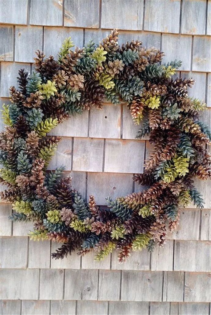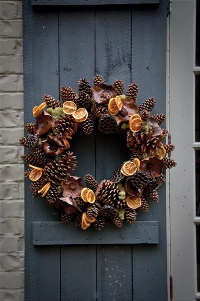 这时候你要是去公园或一些街头绿地,会发现松树地下有很多掉落的松球,不要浪费,把它们捡回来,用热熔胶就可以把它们粘到花环上。装饰的时候,还可以随意加入一些素材,比如风干了的柠檬片、红红的冬青果,来增加趣味和观赏性。