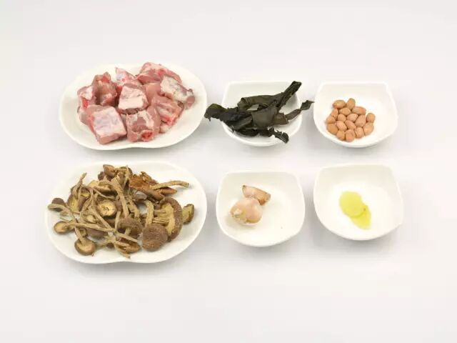 原料:排骨200克、海带100克、茶树菇100克、花生50克、姜2片、盐2茶匙。