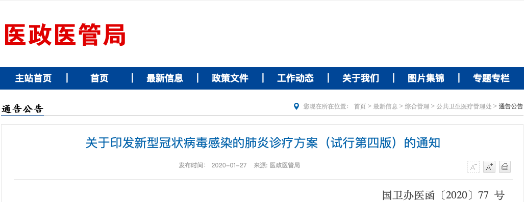 1月28日,国家卫健委、国家中医药管理局发布《新型冠状病毒感染的肺炎诊疗方案(试行第四版)》。