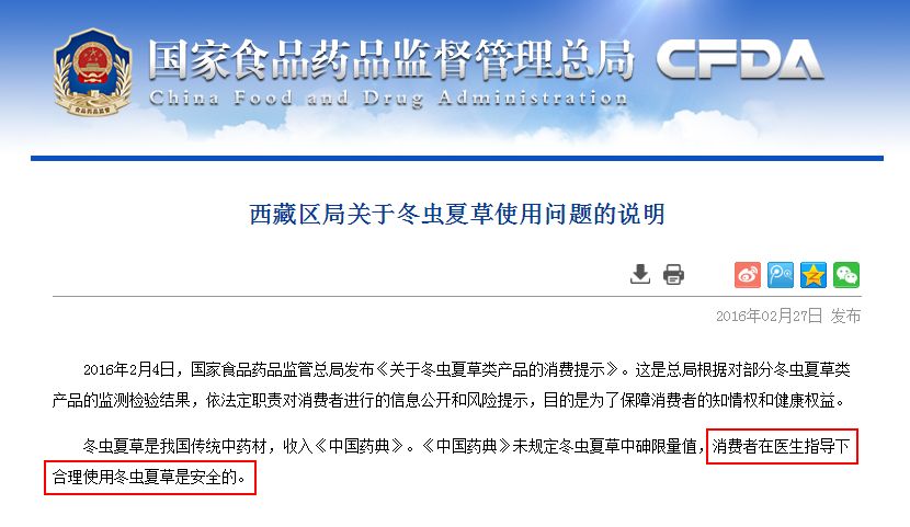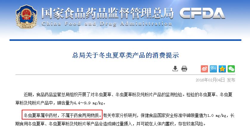 我们来看国家食品药品监督管理总局发布的权威公告:长期食用冬虫夏草会造成砷摄入过量,并可能在人体内蓄积,存在较高风险。
