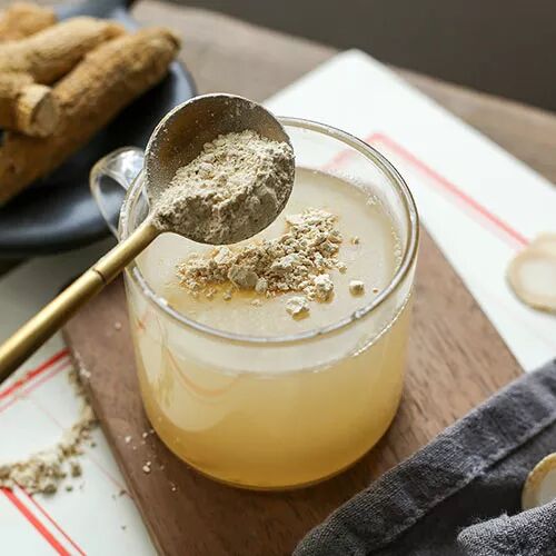 将西洋参研成细粉状,取5克,用纱布或滤纸包好,置杯中,冲入沸水。