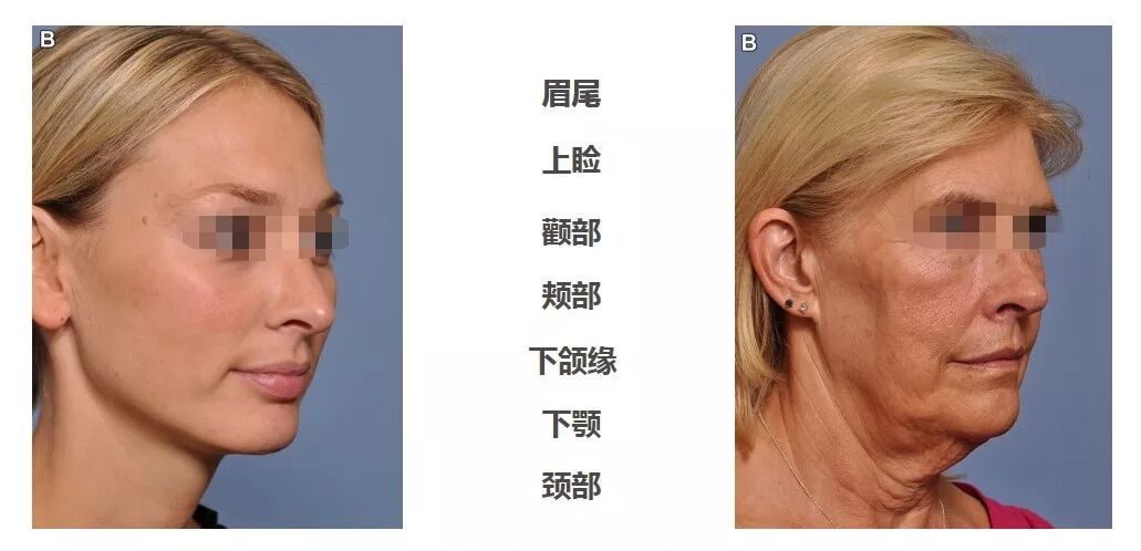 如下图所示,面部的松弛和下垂主要体现在:眉尾、上眼睑、颧部、颊部、下颌缘、下颚部、颈部,这些部位经常出现衰老性的松弛和下垂。