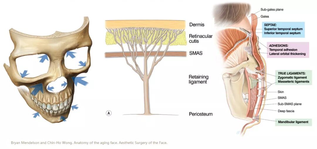 此外,由于面部的不同层次都是通过一条韧带结构,从深到浅固定在骨骼表面的。因此,在这个解剖基础下,随年龄增长这些韧带也会表现出一些特征性的衰老表现。