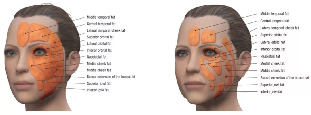 而随着年龄增长,脂肪发生了萎缩和吸收,导致了脂肪间隙的增大,同时,由于脂肪间存在前文描述的韧带结构,也导致了脂肪间的凹陷更加明显,最终导致面部在衰老过程中逐渐表现出局部凹陷及容量相对不足的问题。