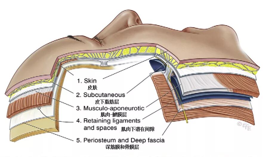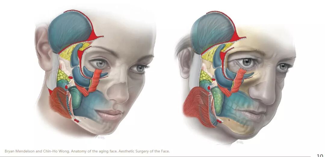 在这些松弛和下垂现象的背后,有着非常多的解剖学原理。整个面部的衰老现象,不单是由我们熟悉的皮肤层、脂肪层所决定的,也包括了其他层次,如肌肉,肌肉下的间隙,甚至是骨骼等。